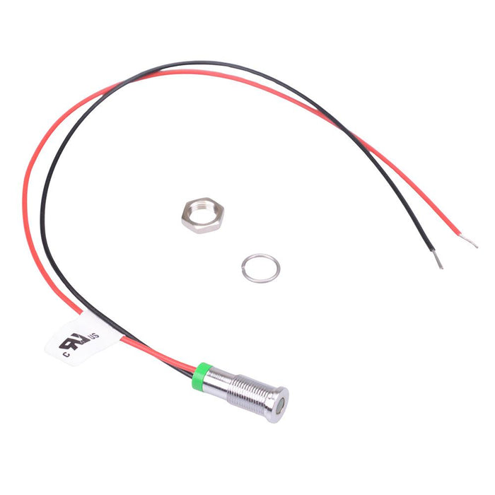 The Q6F7CXXG02 is a green panel mount LED indicator from the APEM Q6 series, featuring a 6mm cut-out. The indicator features a flush chrome bezel and 200mm tail wires. The panel indicator is UL certified and suitable for the most demanding of applications.
