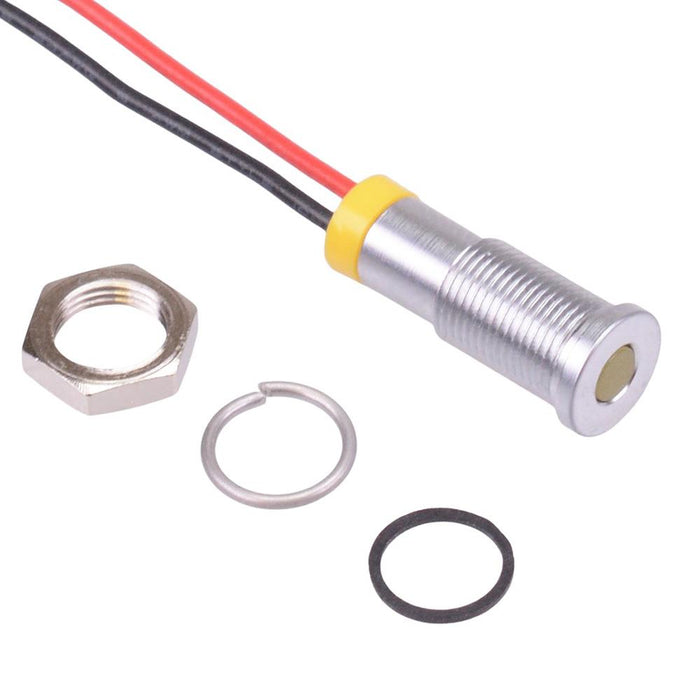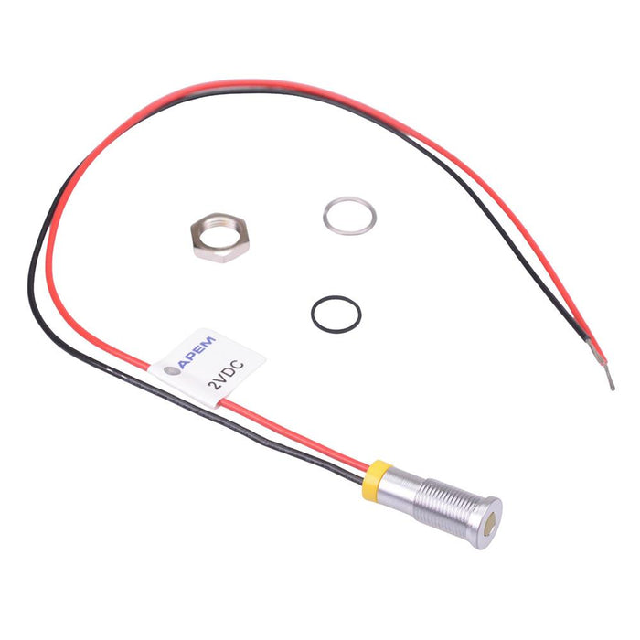 Colour: yellow Panel cut-out: 6mm Voltage rating: 2VDC Current rating: 20mA Panel thickness: 7mm max Brightness: 2180mcd Operating voltage: 1.8 to 3.3VDC Bezel material: satin grey plated brass Protection level: IP67 Terminal type: 200mm wires Length: 16.9mm Diameter: 6.9mm UL, REACH and RoHS certified