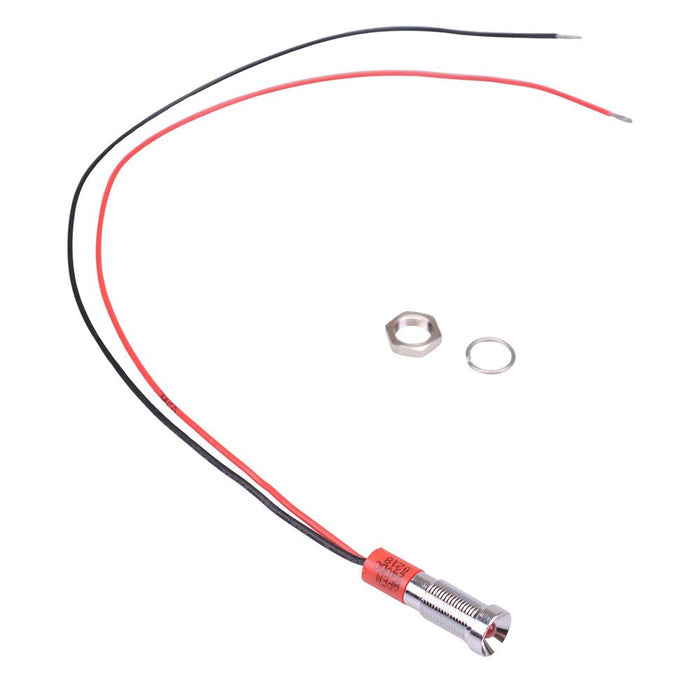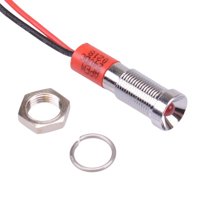 Colour: red Panel cut-out: 6mm Voltage rating: 24VDC Current rating: 20mA Panel thickness: 7mm max Brightness: 40mcd Operating voltage: 21.6 to 26.4VDC Bezel material: chrome plated brass Terminal type: 200mm wires Length: 21mm Diameter: 6.9mm UL, REACH and RoHS certified