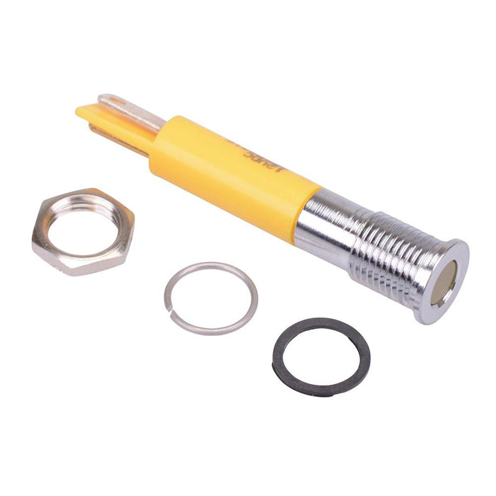 The Q8F1CXXHY12E-X0350 is a hyper bright yellow panel mount LED indicator from the APEM Q8 series, featuring a 8mm cut-out and sealed to IP67. The indicator features a flush chrome bezel and 2.8mm quick connect terminals. The panel indicator is UL certified and suitable for the most demanding of applications.