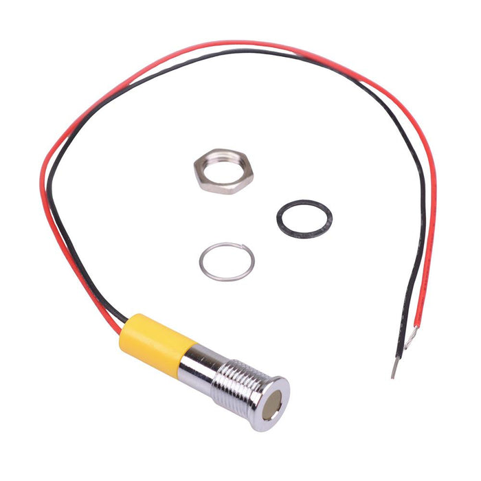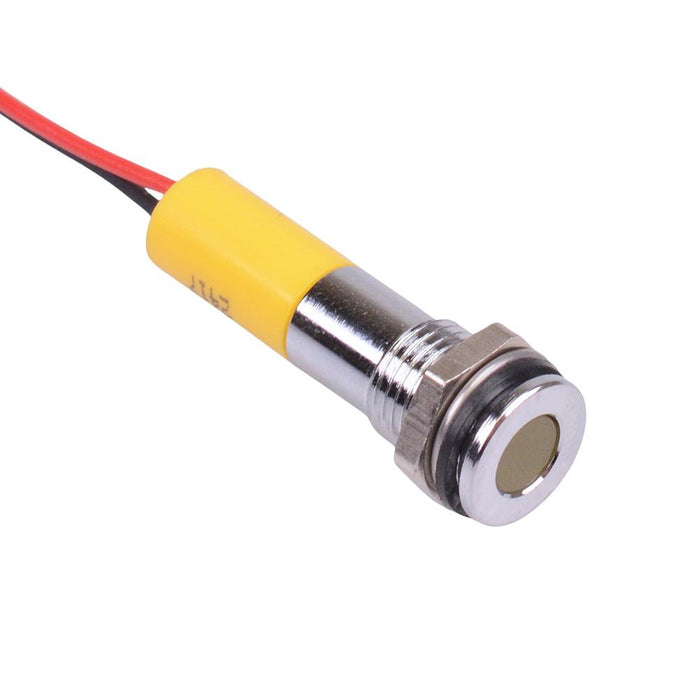 Colour: yellow Panel cut-out: 8mm Voltage rating: 12VDC Current rating: 20mA Panel thickness: 7mm max Brightness: 1560mcd Operating voltage: 10.8 to 13.2VDC Bezel material: chrome plated brass Protection level: IP67 Terminal type: 200mm wires Length: 27.6mm Diameter: 9.5mm UL, REACH and RoHS certified