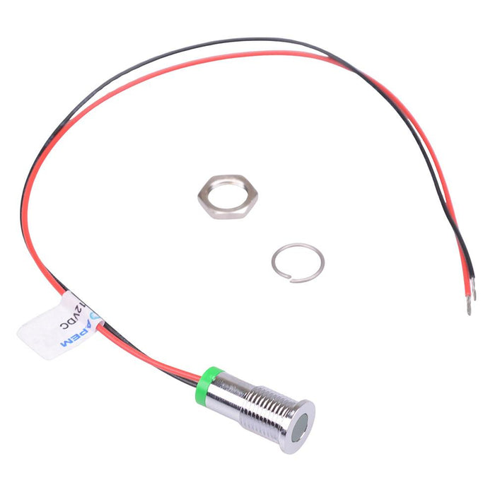 Colour: green Panel cut-out: 8mm Voltage rating: 12VDC Current rating: 20mA Panel thickness: 7mm max Brightness: 6mcd Operating voltage: 10.8 to 13.2VDC Bezel material: chrome plated brass Terminal type: 200mm wires Length: 17.6mm Diameter: 9.5mm UL, REACH and RoHS certified