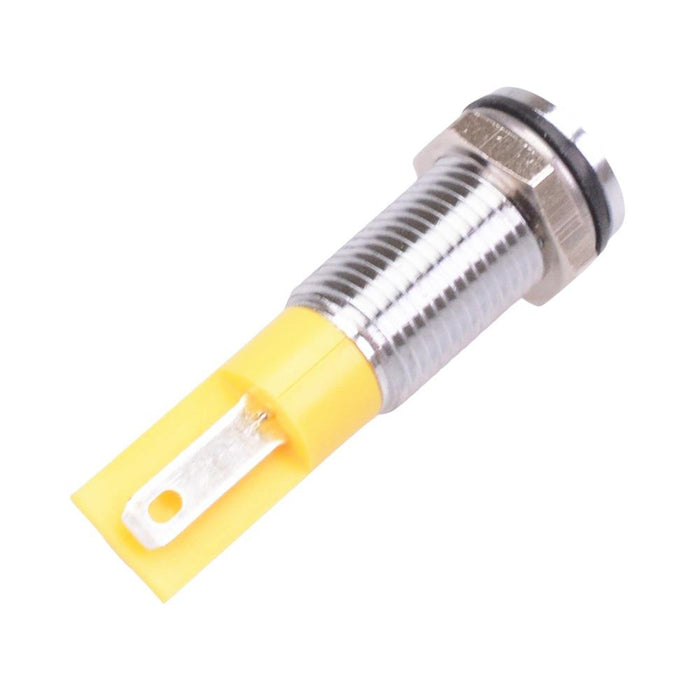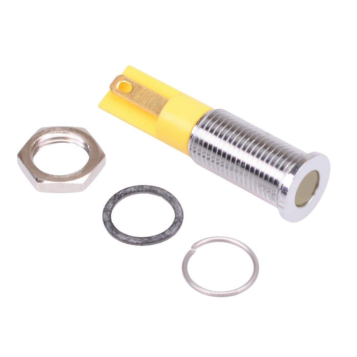 The Q8F9CXXHY12E-X0237 is a hyper bright yellow panel mount LED indicator from the APEM Q8 series, featuring a 8mm cut-out and sealed to IP67. The indicator features a flush chrome bezel and 2.8mm quick connect terminals. The panel indicator is UL certified and suitable for the most demanding of applications.