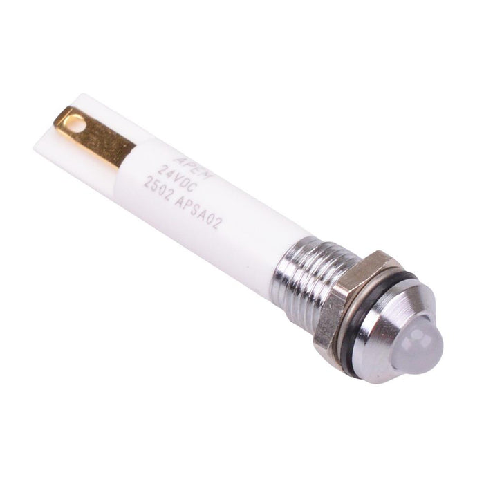 The Q8P1CXXHW24E is a hyper bright white panel mount LED indicator from the APEM Q8 series, featuring a 8mm cut-out and sealed to IP67. The indicator features a prominent chrome bezel and 2.8mm quick connect terminals. The panel indicator is UL certified and suitable for the most demanding of applications.