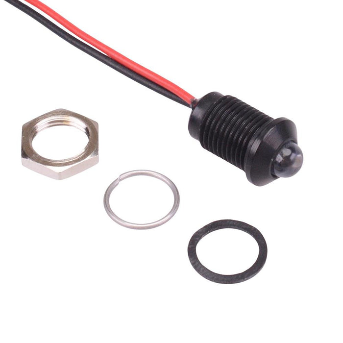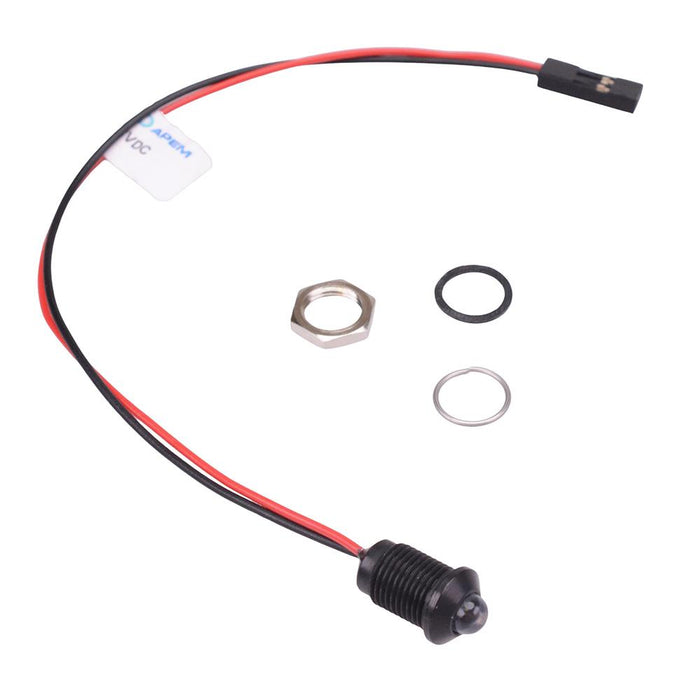 Colour: blue Panel cut-out: 8mm Voltage rating: 3.3VDC Current rating: 20mA Panel thickness: 7mm max Brightness: 2200mcd Operating voltage: 1.8 to 3.3VDC Bezel material: black plated brass Protection level: IP67 Terminal type: rear epoxy 200mm wires Length: 15.6mm Diameter: 9.5mm UL, REACH and RoHS certified