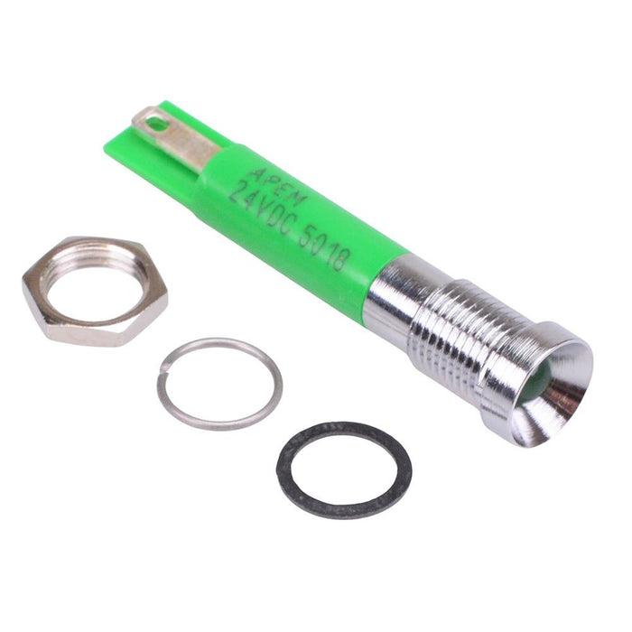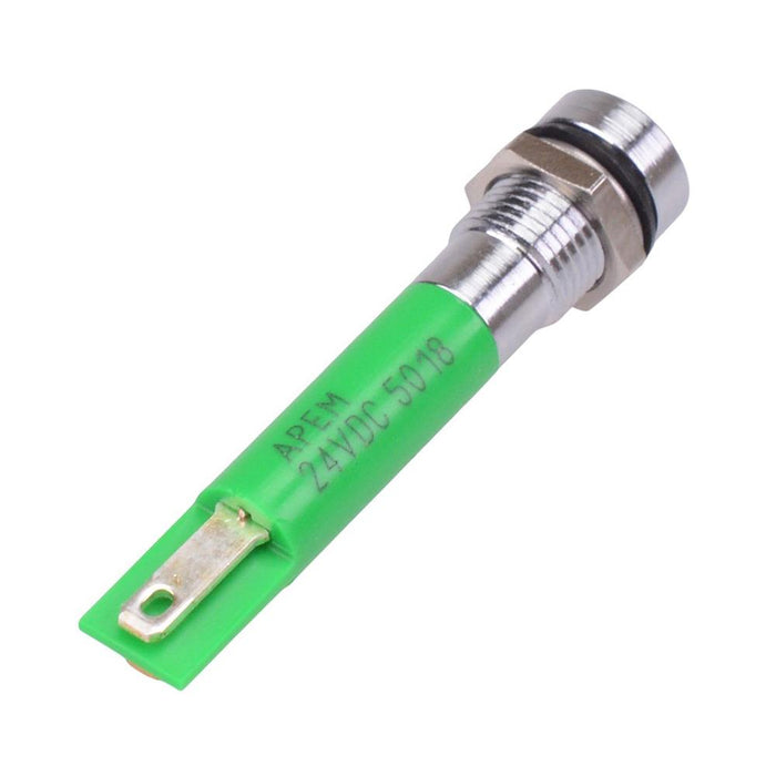 Colour: green Panel cut-out: 8mm Voltage rating: 24VDC Current rating: 20mA Panel thickness: 7mm max Brightness: 1900mcd Operating voltage: 21.6 to 26.4VDC Bezel material: chrome plated brass Protection level: IP67 Terminal type: quick connect / solder 2.8 x 0.8mm Length: 34.85mm Diameter: 9.4mm UL, REACH and RoHS certified