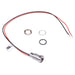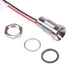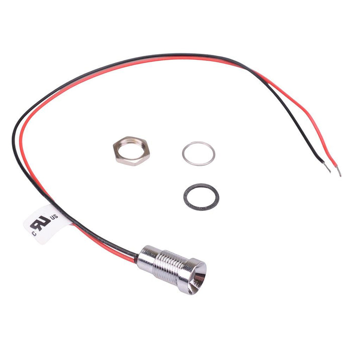 Colour: green Panel cut-out: 8mm Voltage rating: 12VDC Current rating: 20mA Panel thickness: 7mm max Brightness: 10,000mcd Operating voltage: 10.8 to 13.2VDC Bezel material: chrome plated brass Protection level: IP67 Terminal type: rear epoxy 200mm wires Length: 16.5mm Diameter: 9.4mm UL, REACH and RoHS certified