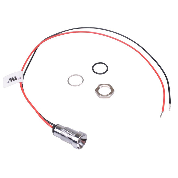 Colour: red Panel cut-out: 8mm Voltage rating: 6VDC Current rating: 20mA Panel thickness: 7mm max Brightness: 5000mcd Operating voltage: 5.4 to 6.6VDC Bezel material: chrome plated brass Protection level: IP67 Terminal type: rear epoxy 200mm wires Length: 16.5mm Diameter: 9.4mm UL, REACH and RoHS certified