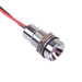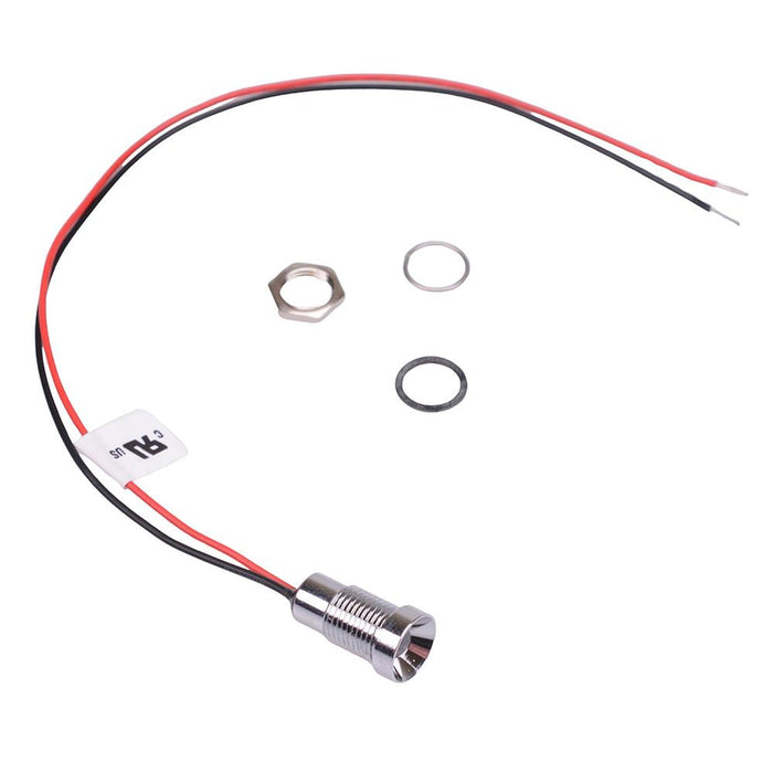 Colour: red Panel cut-out: 8mm Voltage rating: 12VDC Current rating: 20mA Panel thickness: 7mm max Brightness: 5000mcd Operating voltage: 10.8 to 13.2VDC Bezel material: chrome plated brass Protection level: IP67 Terminal type: rear epoxy 200mm wires Length: 16.5mm Diameter: 9.4mm UL, REACH and RoHS certified