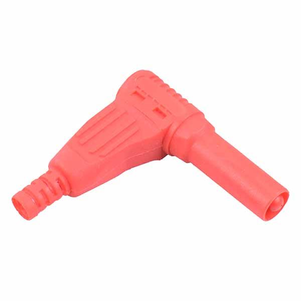 Right angle red shrouded 4mm test plug featuring PA insulation and solder contacts, making the connector suitable for a wide range of test applications.