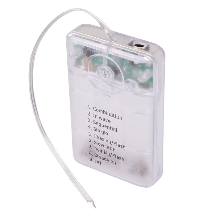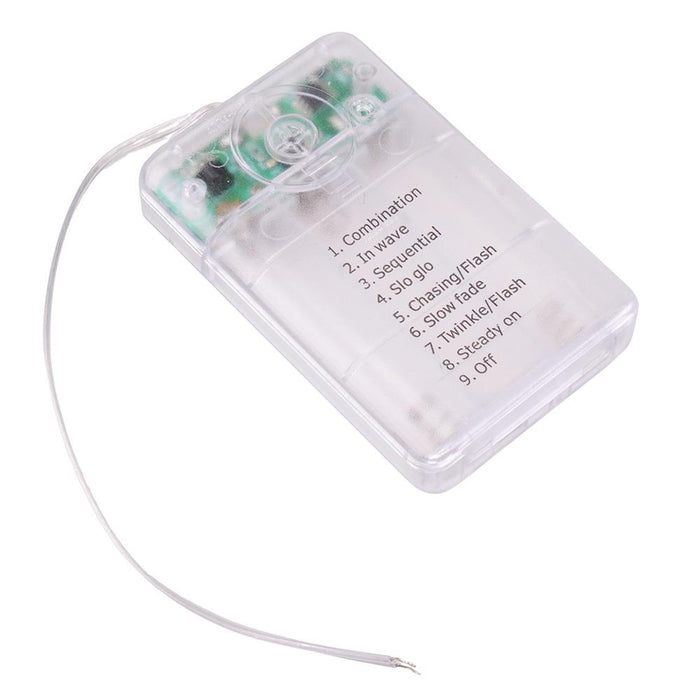 Holds 3 AA batteries 8 light effects Clear case Includes remote control and USB lead Dimensions: 80.8 x 52.7 x 18.9mm