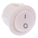 White circular rocker switch with SPST contacts and on-off action. The switch is designed for snap-in mounting and is suitable for a wide range of applications.